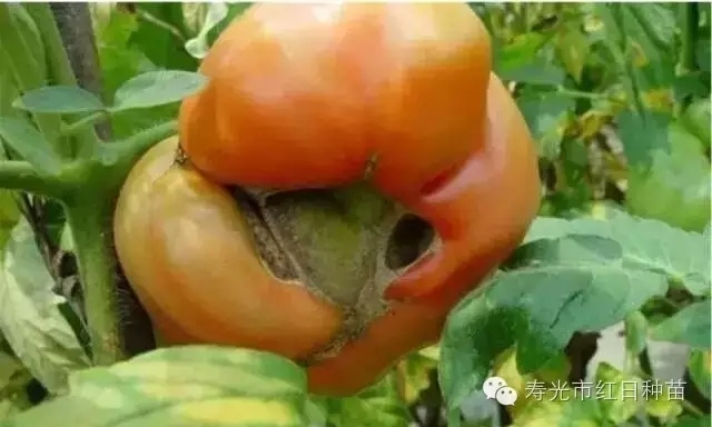 番茄顶裂果主要是由于畸形花花柱开裂的结果。直接原因是番茄开花时,对花器供给的养分不足造成的。生产中在低温季节或在大棚中定植过早尤其严重。
