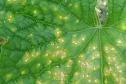 症状表现:细菌性叶斑病侵染甜瓜果实,常造成发病处果皮呈绿色不转色。远远看去,果实表皮密密麻麻着生小绿点。此病为害叶、茎、瓜,以叶受害较严重。在甜瓜各生育期均可发生。子叶受害呈水浸状近圆形凹陷斑,后变成黄褐色。果实和茎蔓染病,病斑呈油浸状,深绿色,严重时龟裂或形成溃疡,溢出菌液。果实发病,病菌可向内一直扩展到种子,使种子带菌。