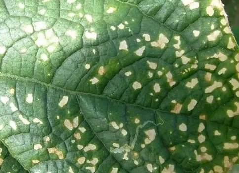 症状表现:黄瓜靶斑病又称“小黄点子病”,起初为黄色水浸状斑点,直径约1毫米左右。发病中期病斑扩大为圆形或不规则形,易穿孔,叶正面病斑粗糙不平,病斑整体褐色,中央灰白色、半透明。后期病斑直径可达10~15毫米,病斑中央有一明显的眼状靶心,湿度大时病斑上可生有稀疏灰黑色霉状物,呈环状。