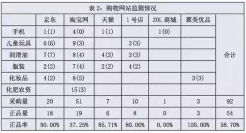 从各购物网站的检测结果来看,淘宝网的样本数量分布最多,但其正品率最低,仅为37.25%;样本数量较小(3个)的聚美优品均为正品,正品率达到了100%;另ZOL商城(中关村电子商城)购买了1件非正品,正品率为0%;三大知名B2C平台中,京东的正品率为90%,略高于天猫的85.71%和1号店的80%,同时京东和1号店的非正品均来源于非自营的商家。(见表2)
