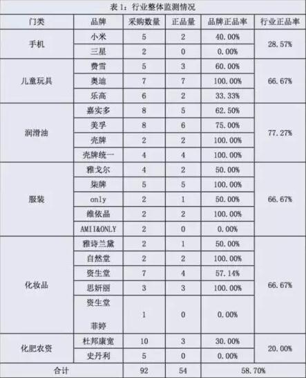 此次监测共完成92个批次的样品采样,其中有54个批次的样品为正品,正品率达到58.7%,非正品率为41.3%。(注:这里统一将假冒伪劣产品、翻新产品、非授权正规渠道,含量与宣传不符产品、无3C认证,非中国大陆地区官方正品、不符合《消费品使用说明 化妆品通用标签》要求产品等均列为非正品)。