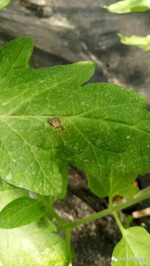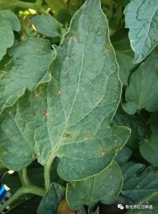 发病初期叶片出现近圆形或不规则的水浸状透明的斑点,后期病斑发展为不规则形,病斑的中部呈灰白色,病斑稍凹陷,易破裂、穿孔。
