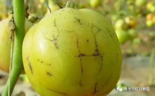 例如,在青果期或白熟后,棚内高温干旱,湿度过低,导致果皮干燥就会出现干裂;在青果期,摘叶过早,棚内湿度小,果皮迅速脱水也会导致突然出现皴裂;棚内低温高湿,突然放风,使果皮表面的露水快速蒸发,随之在果皮表面形成微小皴纹,后期果实膨大,变为皴纹果。